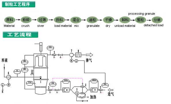 沸騰制粒干燥機利用換熱器加熱的空氣形成熱空氣,通過閥板將熱空氣分配到主機中。濕物料從進料機進入干燥機。由于氣壓的作用,物料在干燥器中形成沸騰狀態,與熱風廣泛接觸,在較短的時間內完成物料的干燥。沸騰制粒干燥機是一種干燥設備,又稱流化床。一般由加熱器、沸騰床主機、旋風分離器、袋式除塵器、引風機、操作臺等組成。根據物料性質的不同,可根據需要選用旋風分離器或袋式除塵器。沸騰干燥機提高了流動性,減少了粉末造粒飛塵;通過粉末造粒提高了溶解性;在一臺機器中混合、造粒、干燥完成一步造粒;使用抗靜電濾布,設備安全運行;設置泄壓孔,一旦發生爆炸,設備人員不受傷害;設備無死角,裝卸料輕便快捷,沖洗干燥。凈,符合GMP規范。